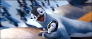 After the Aliens leave, Mumble gets an idea. by dancing, tap dancing, the whole Adélie Land penguin group could get enough snow and ice to fall and create a ramp which the trapped penguins could climb up. Soon, a chunk of ice is loosened and falls down-with Erik on it. He manages to grip a strand of Lovelaces sweater and hangs by it. Mumble, who noticed this early, comes rushing down and grabs the other end of this string, barely saving Erik from his fall, but at the same time, hurting his foot as he wedges it into a small ice crack. After Erik is pulled to safety, Mumble tries again to get the crowds of penguins dancing, but unsuccessfully, due to his broken foot. Sven pipes up here, asking to try and dance in his way. As Mumble observes Sven's "Dance from my homeland.", he concludes that they would need more "oomph." So he and Erik go out and seek the Elephant Seal, Bryan, to help in collapsing the ice.